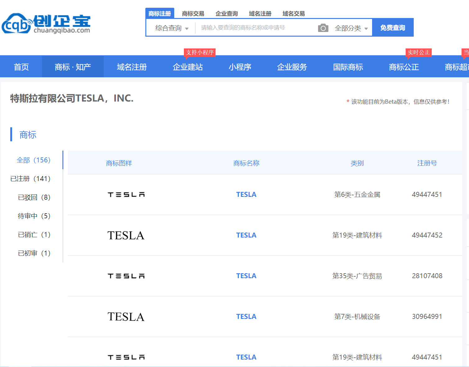 特斯拉名下商标一共156件申请,成功申请件数141件,驳回有8件,正常申请中有5件,销亡1件、已初审1件。如下图所示