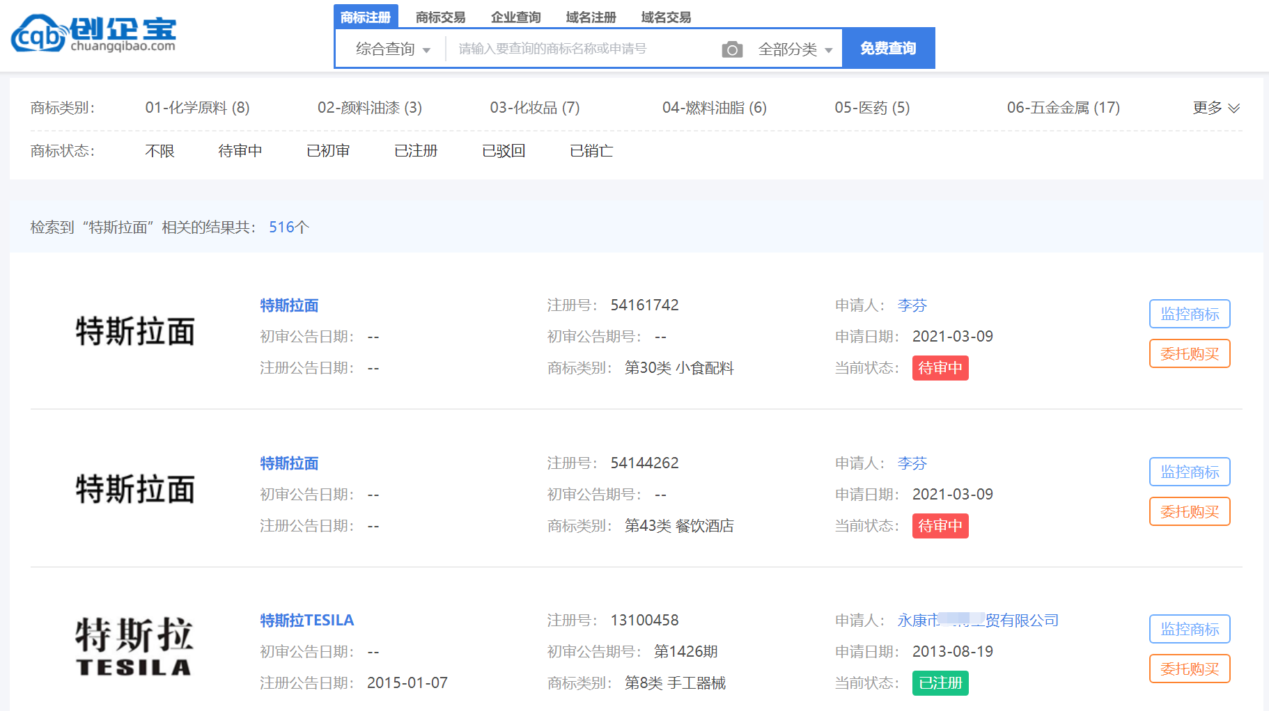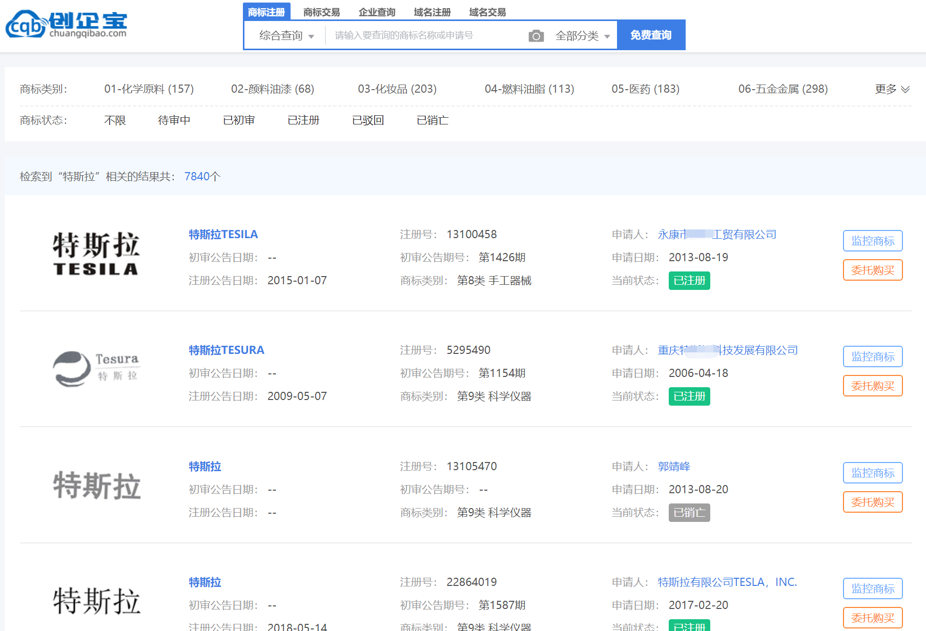 创企宝法务顾问经查询发现,特斯拉商标近7000多件。特斯拉运营主体(特斯拉有限公司TESLA,INC.)的相关商标被多家企业及个人申请注册。(如下图所示)最早是一家公司,在2006年就申请注册,历经3年将在2009年取得商标证。